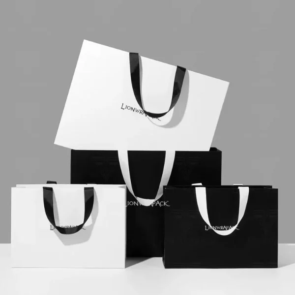 Sacchetto di carta di lusso stampato sacchetti di carta di lusso di lusso sacca per la spesa del logo oem. Questo elegante sacchetto di carta in bianco e nero combina l'estetica minimalista con una consistenza premium, rendendolo perfetto per marchi di lusso, negozi al dettaglio, imballaggi regalo e boutique. Con ampie manici a nastro e costruzione rinforzata, garantisce sia la bellezza che la forza nella presentazione.